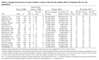 oxygen for 18 people (e.g., American Forests 2006; TreePeople 2006), but based on this study, this estimate appears to be high by at least a factor of two. The number is more on the order of eight people per acre of tree cover (100% tree canopy)."